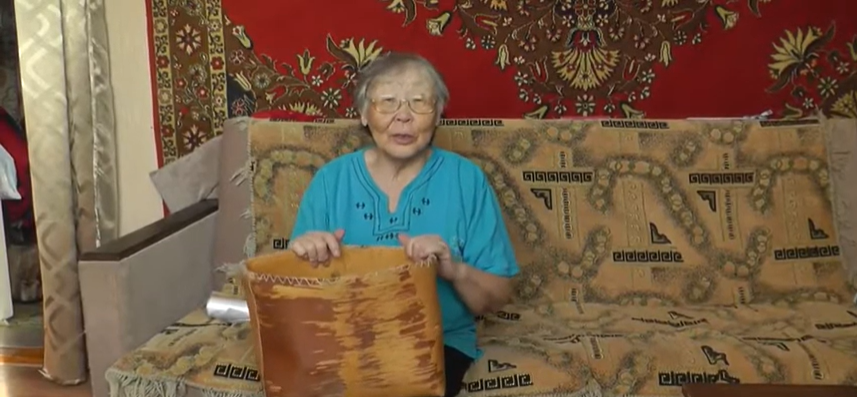 Дарья Ивановна Надеина показывает берестяную посуду и объясняет, как ее делают и для чего используют.